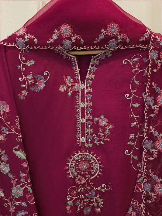 Asim Jofa Embroidered Raw Silk 3 piece Suit with Velvet Shawl Dupatta