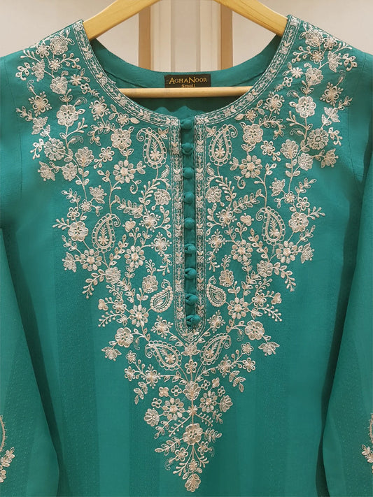 AGHANOOR PURE CHIFFON BEAUTIFUL EMBROIDERED SHIRT AND SILK PANT