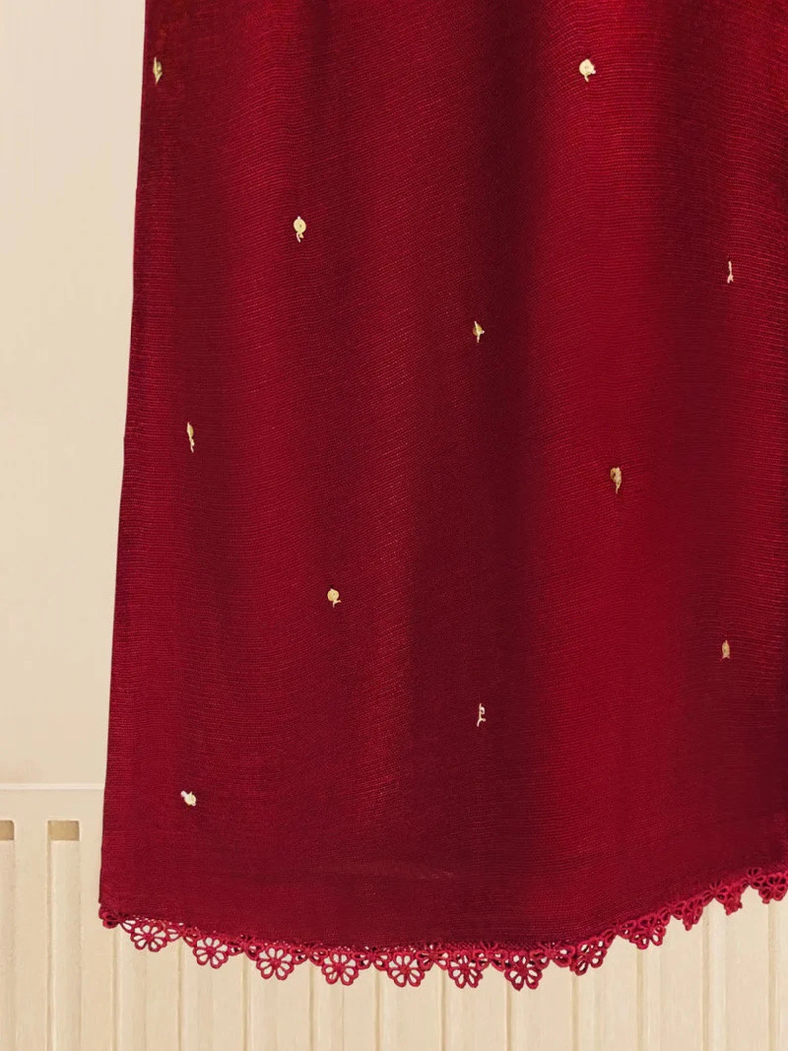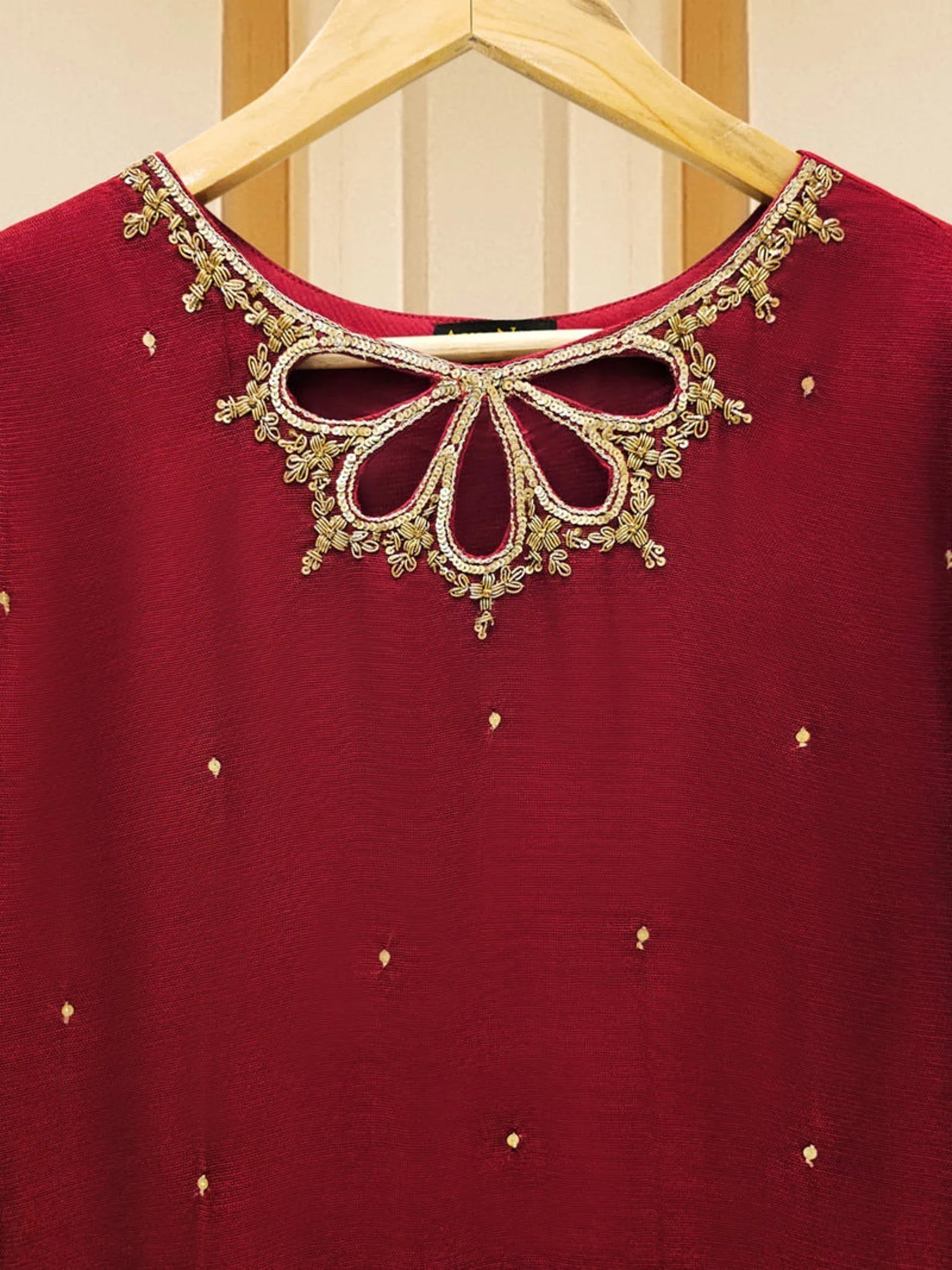 Elevate your style with our hot pink embroidered cotton net straight shirt crafted with utmost care and attention to detail. The shirt features intricate embroidery on the neck line adding a touch of timeless charm.