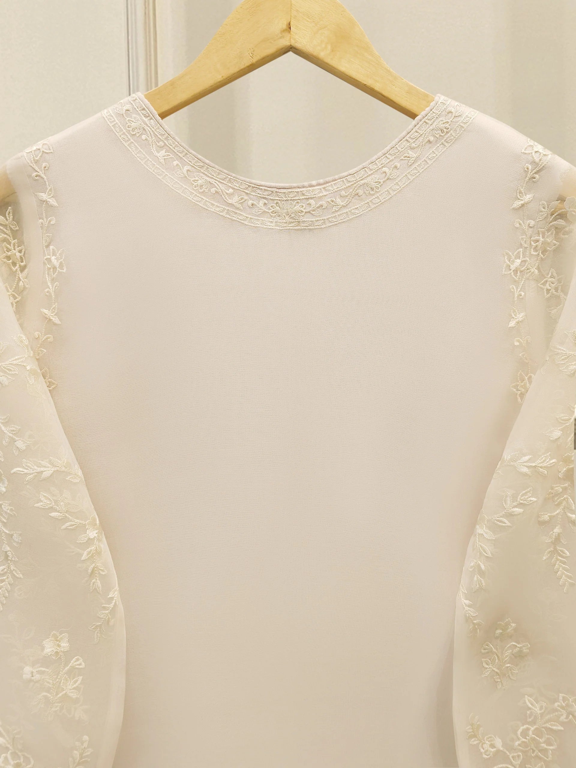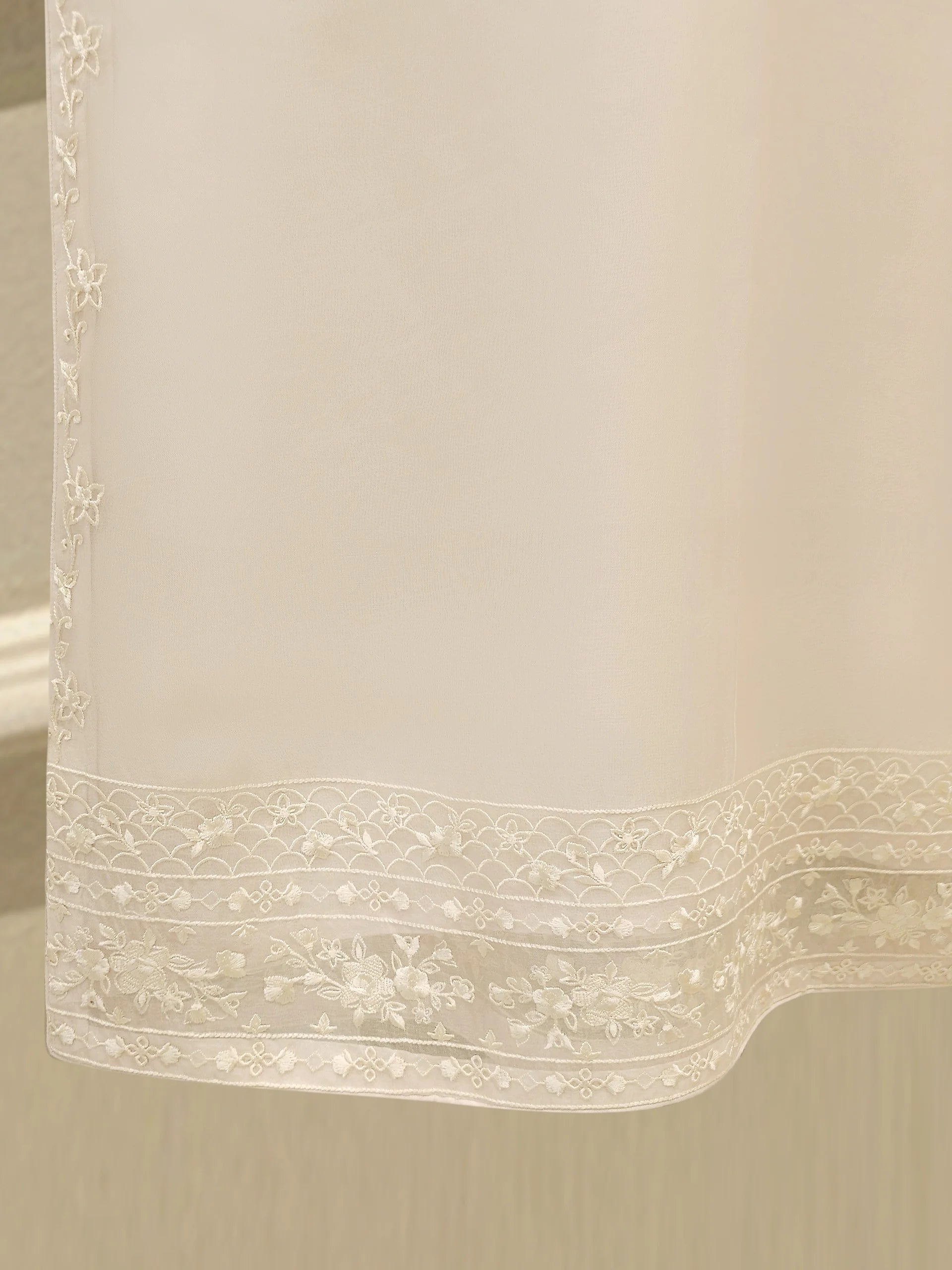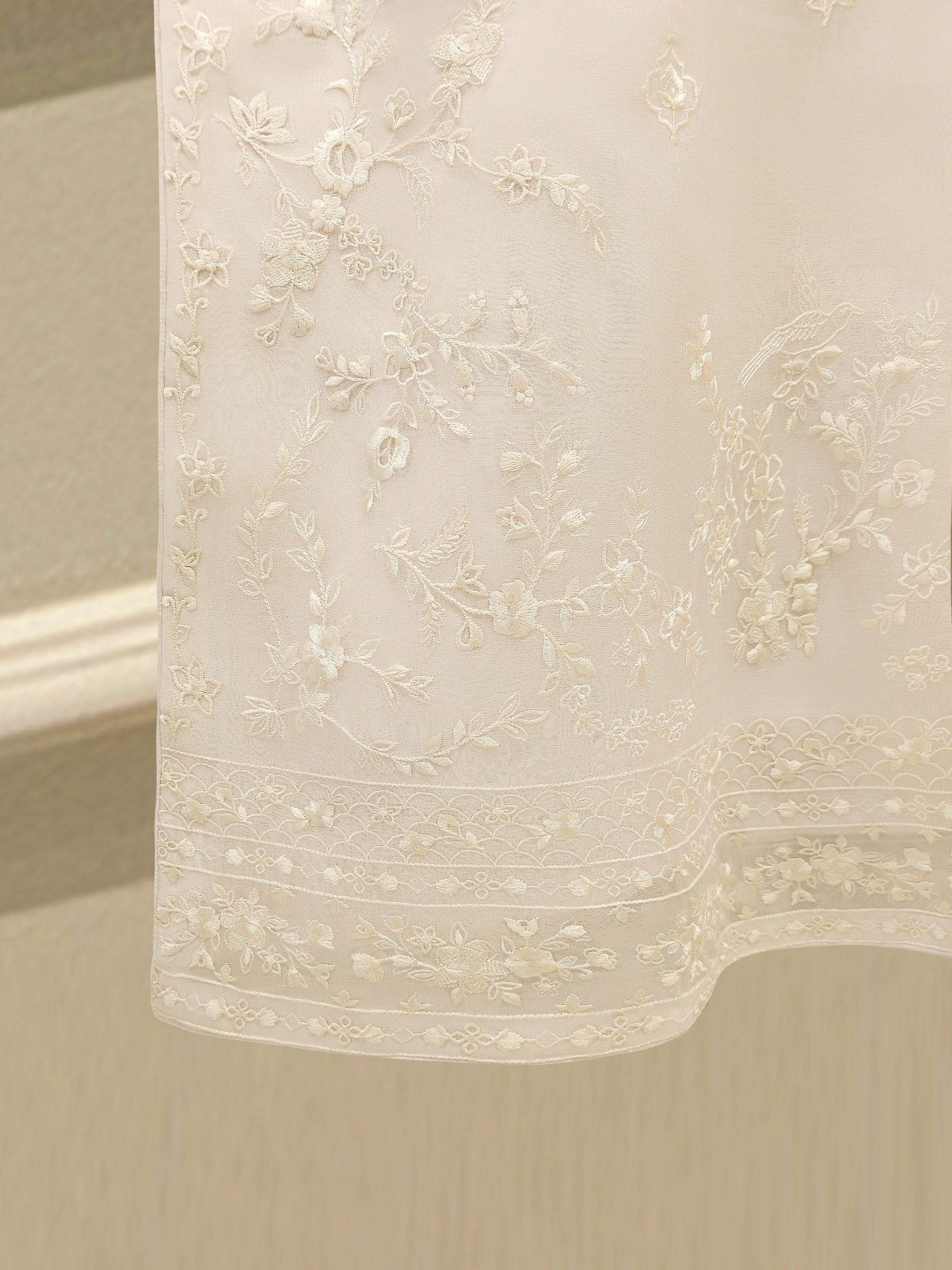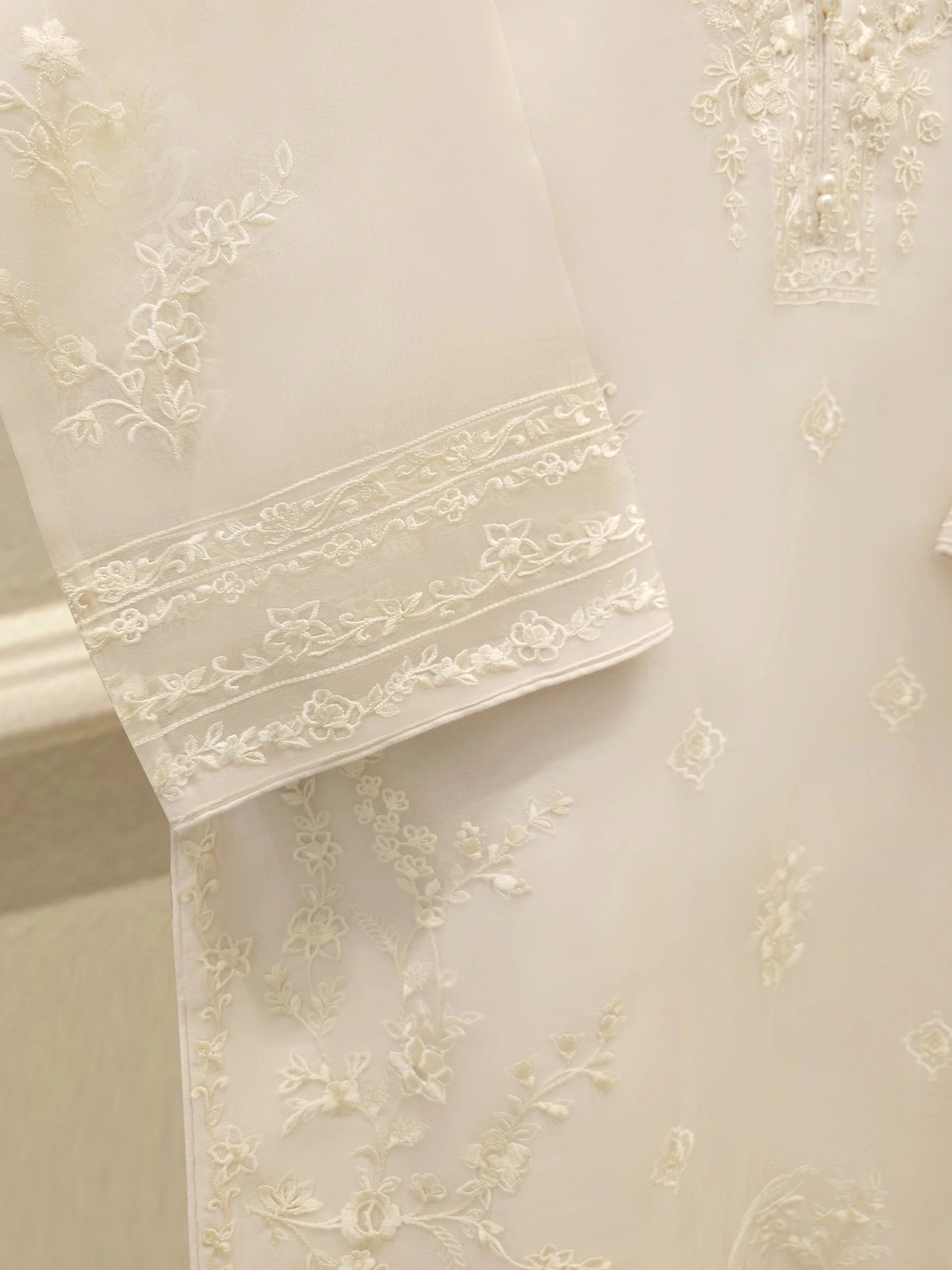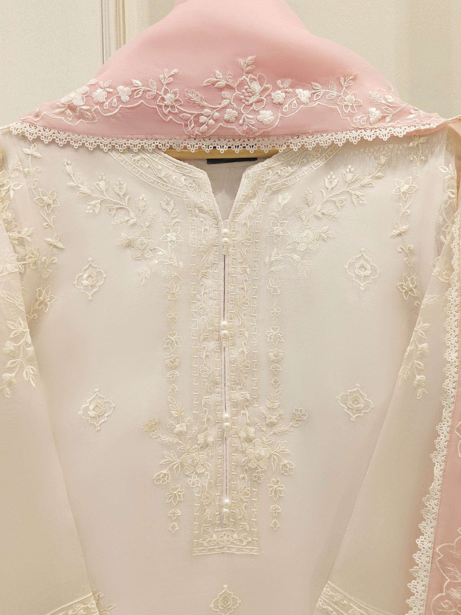 Aghanoor Pure Embroidered Organza Suit with featuring luxurious silk pants & delicate baby pink organza dupatta. Step into timeless sophistication! Elevate your style with this embroidered organza straight shirt crafted with utmost care and attention to detail. The shirt features intricate embroidery on the front, daman and sleeves, adding a touch of timeless charm.