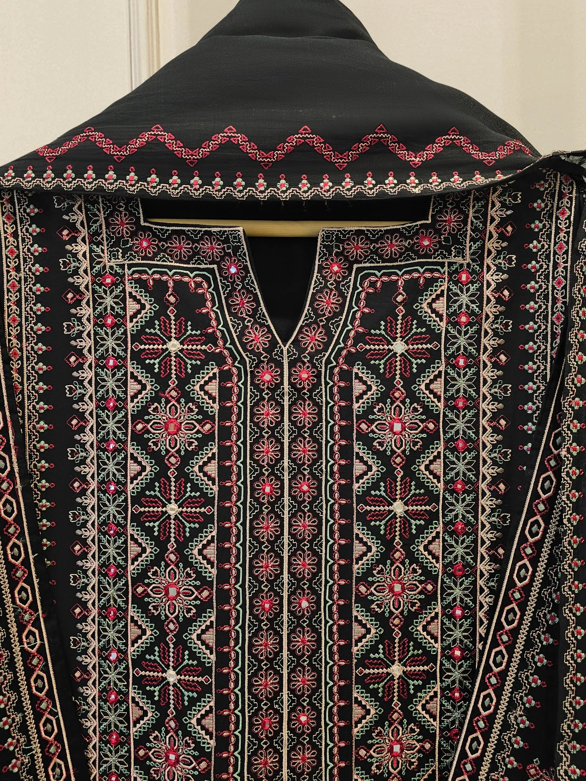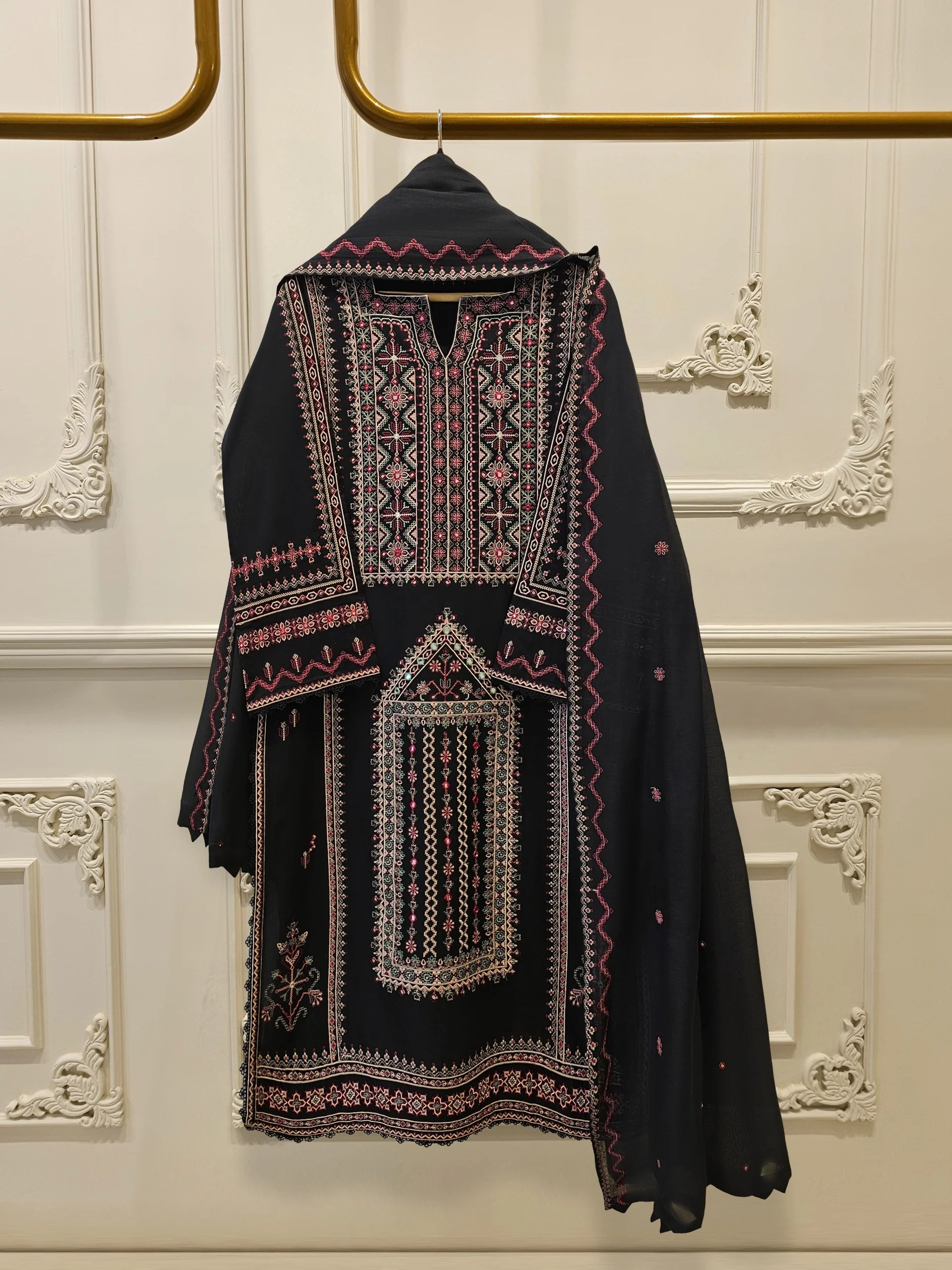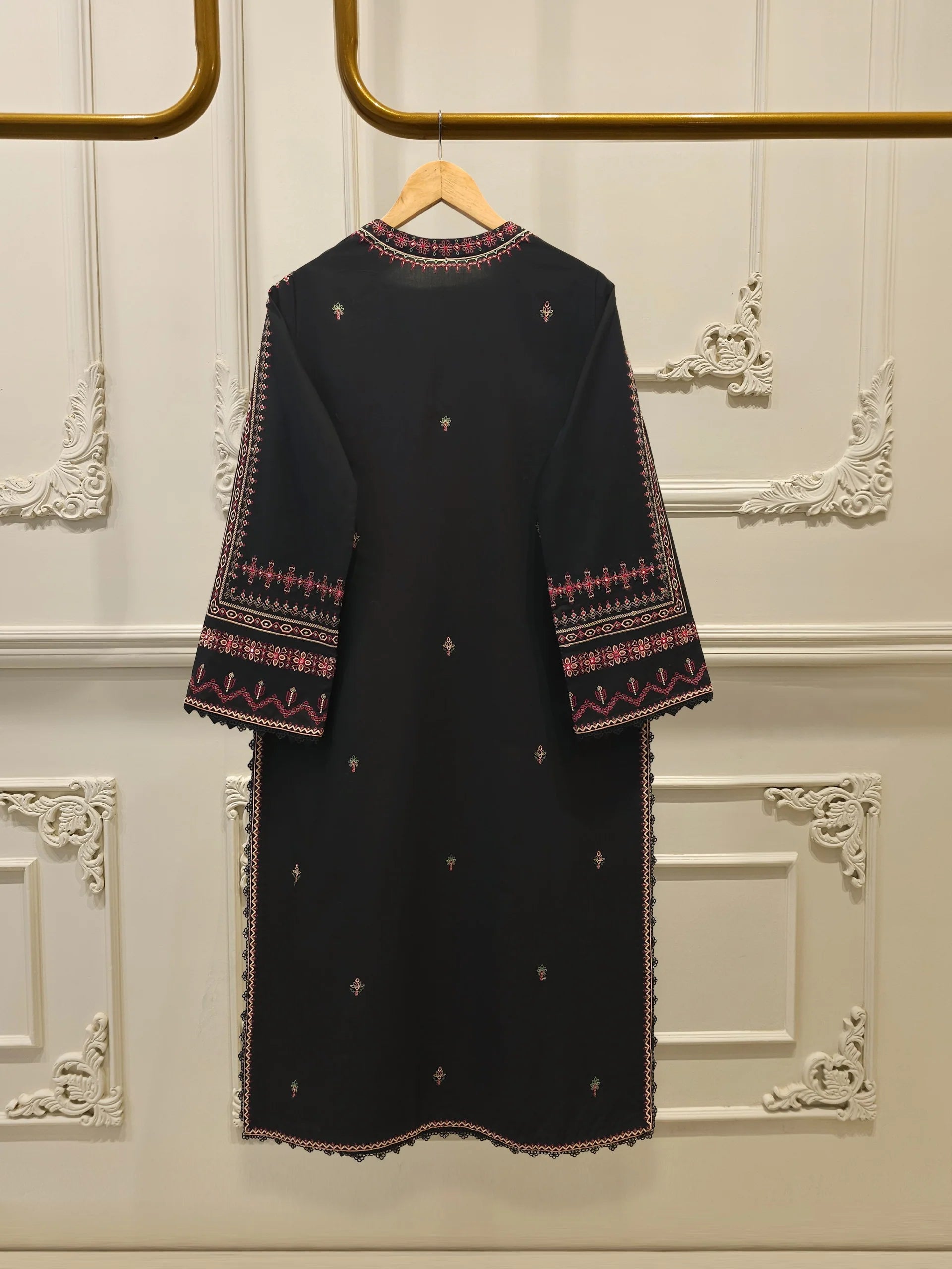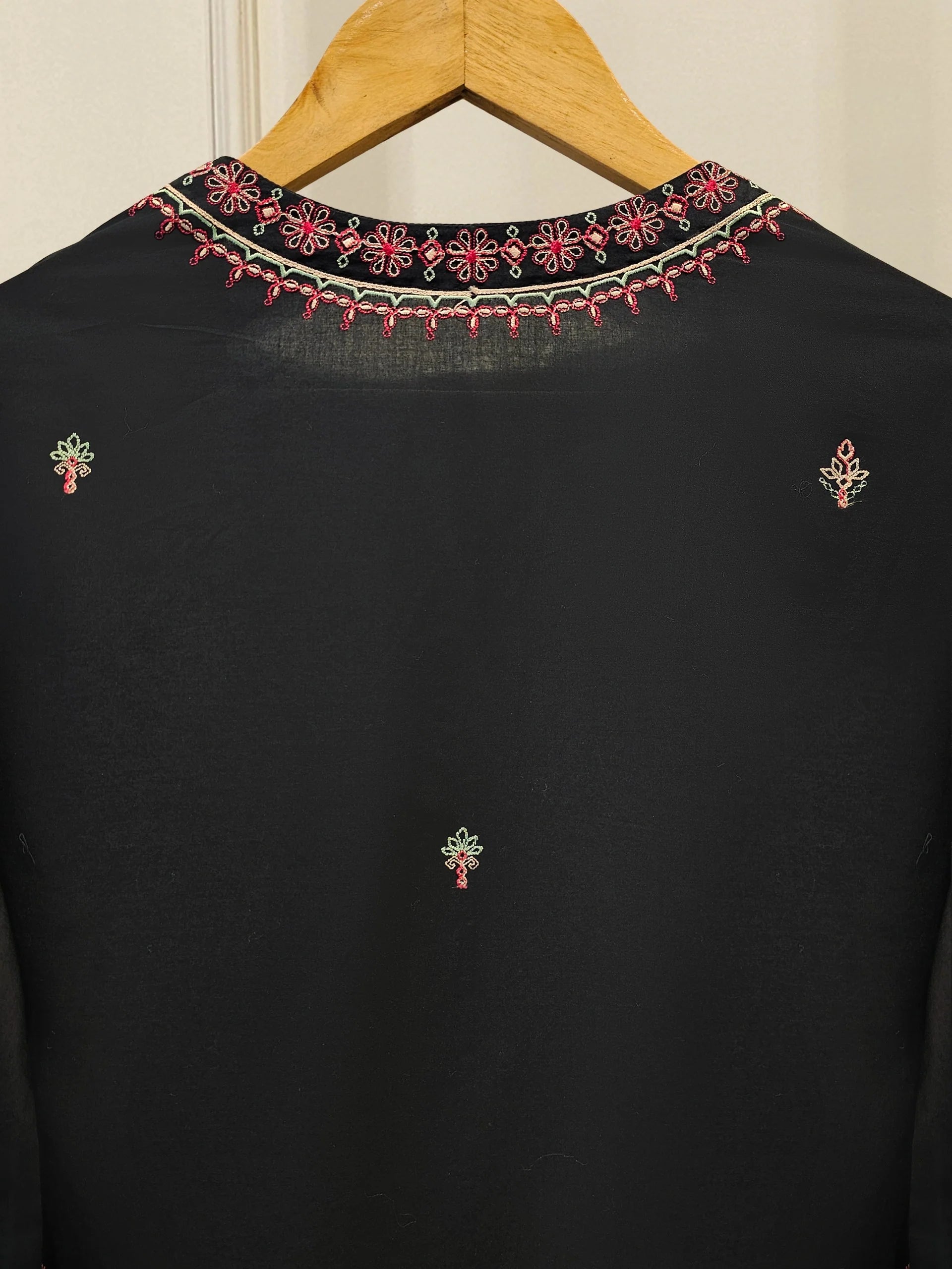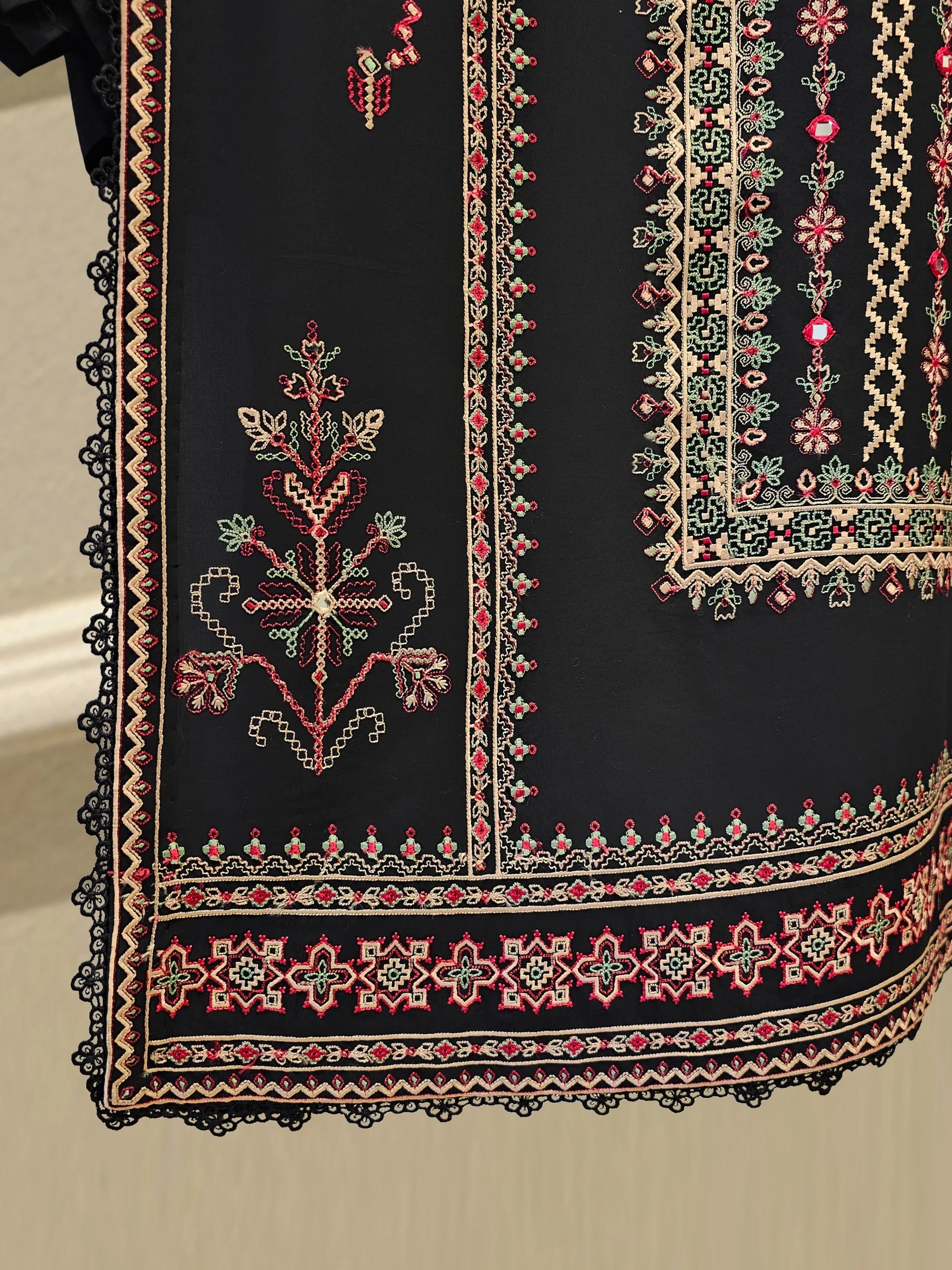 Elevate your summer wardrobe with this beautifully crafted black lawn shirt, featuring intricate Chikan Kari work on the sleeves and daman. Designed for timeless elegance, this piece blends breathable lawn fabric with traditional craftsmanship, perfect for festive occasions or casual sophistication. Pair it with pants for a complete look.