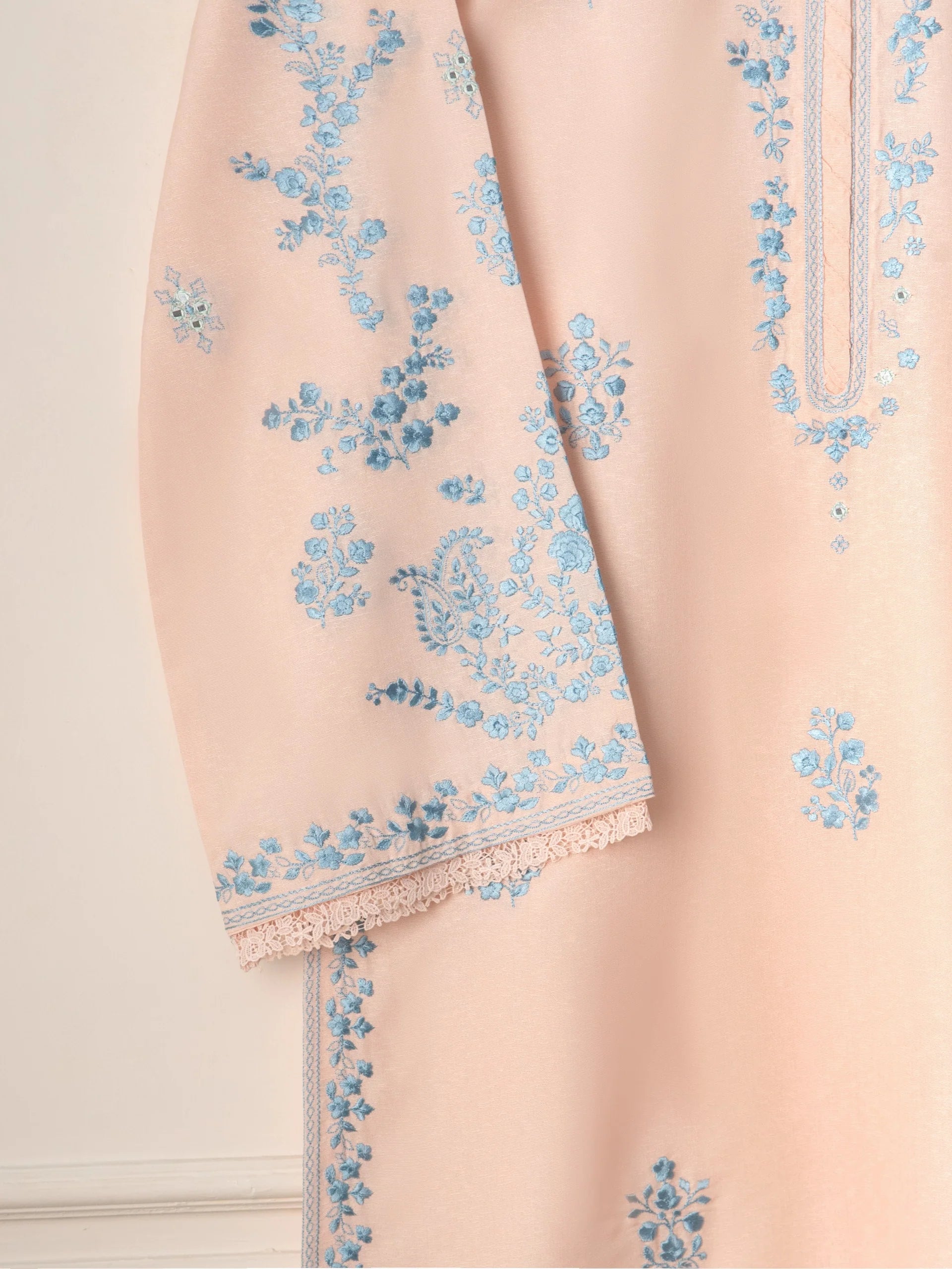 Embrace the festivities of the season in style with our beige two-piece accented with intricate embroidery. Our exquisite suit is crafted in karandi fabric, embodying elegance and grace. The ensemble is paired with dupatta.