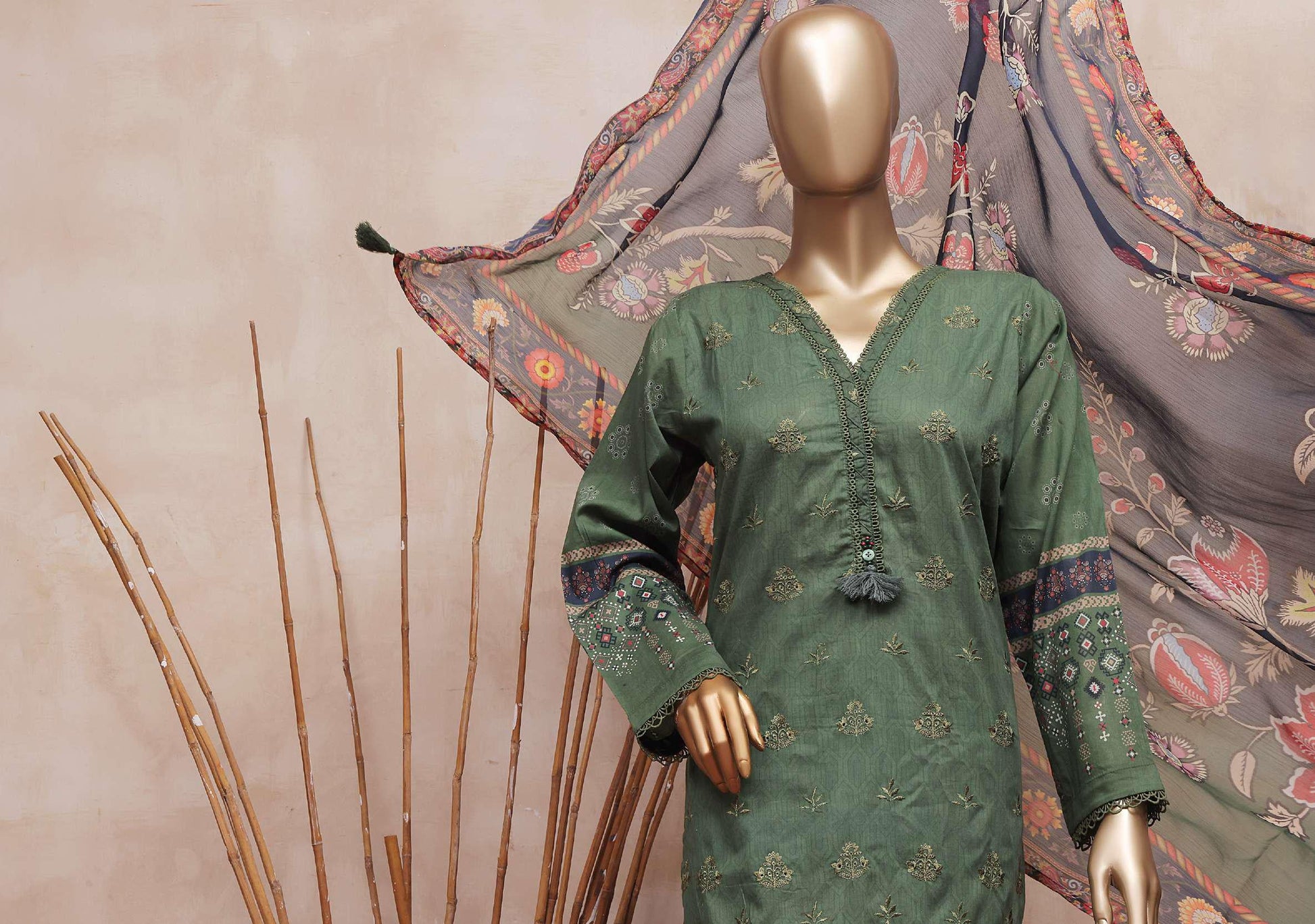 Sadabahar Lawn ChikanKari Stitched Suit with Embroidered Chiffon Dupatta and Cotton Dyed Pant